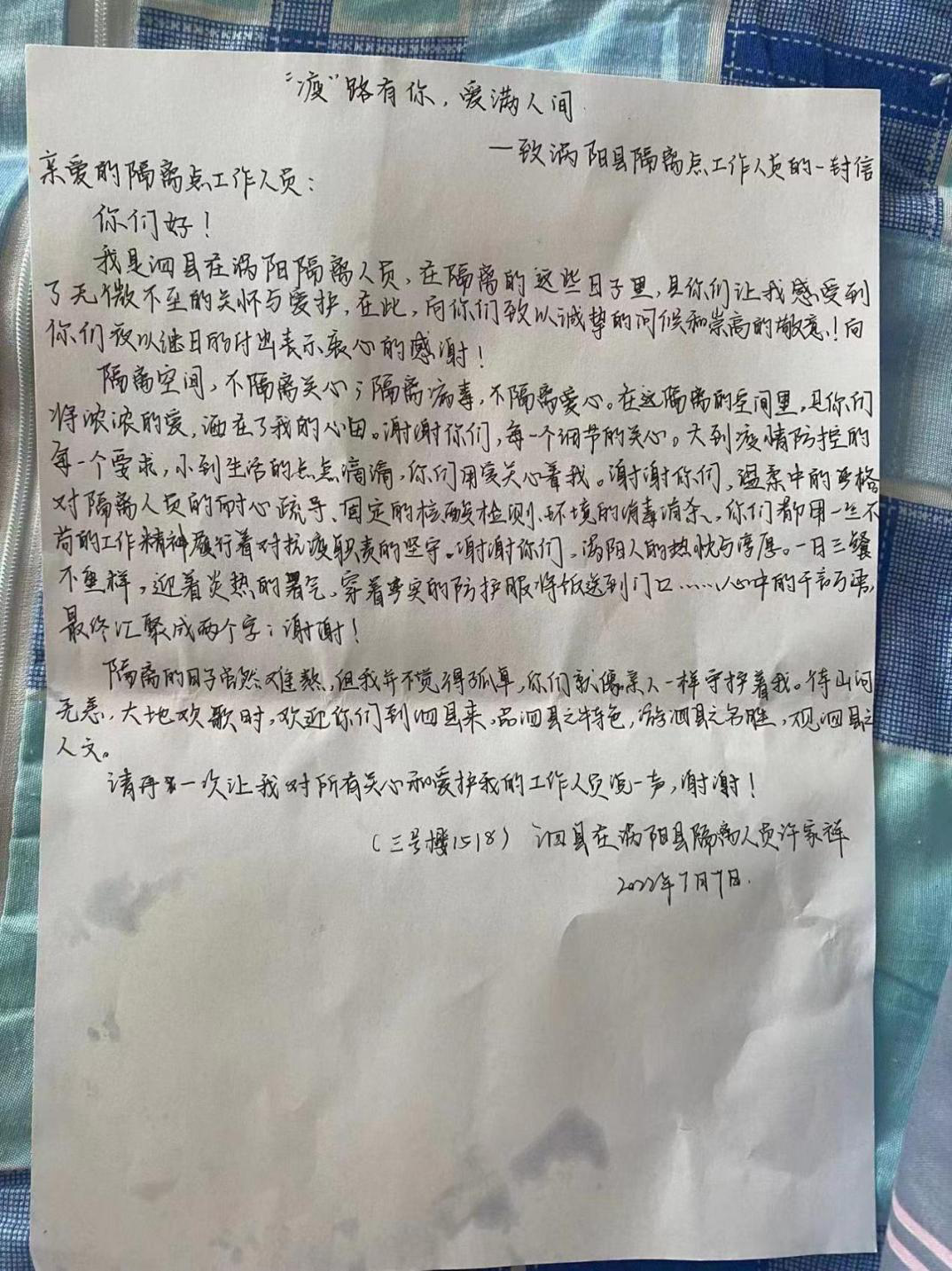 对生活的全面保障,对问题的精心解决,对心理的耐心疏导……医护人员的辛勤付出得到了隔离人员的肯定与支持,他们纷纷写下感谢信、送上锦旗以表谢意。