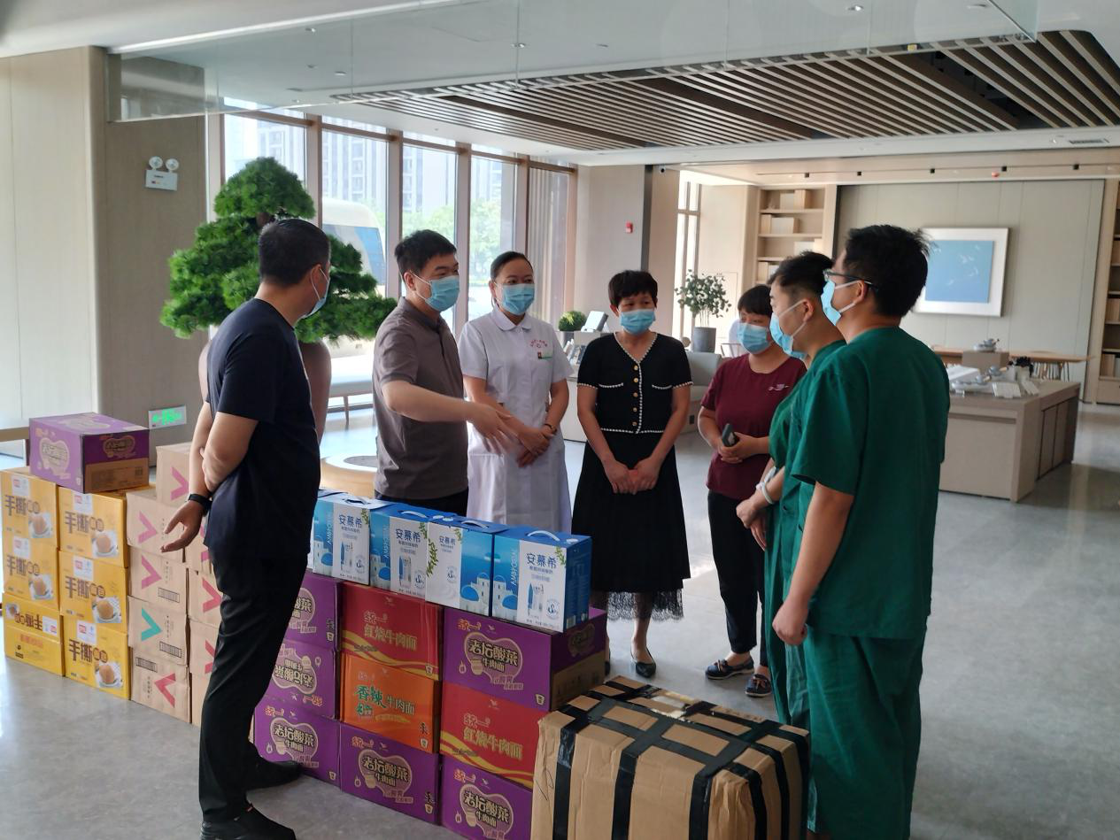 为落实上级有关夏日送清凉、开展关心关爱相关工作要求,2022年8月4日,院党委书记张锦带领党委委员、工会主席韩敏,党委委员、纪委书记栗莉平,党委委员张永强,护理部主任徐程莹前往邻里中心隔离点、隔离酒店、急诊、检验科、发热门诊、安保部、核酸检测点、预检分诊等处看望慰问高温天气中仍坚守疫情防控和医疗救治重点工作岗位的医护人员,为他们送去生活用品、食品饮料等物资,同时送去炎炎夏日院领导班子的关心关爱。