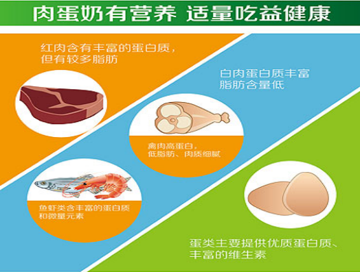 肉蛋奶大豆类是优质蛋白质来源,推荐每餐从肉、蛋、奶、大豆类中选择一或两种吃:每天肉类总摄入量80—150克,其中鱼虾每周最好吃2-4次;蛋类每天一个;牛奶300ml;大豆(包括黄豆、黑豆、青豆)及坚果类每日30-50克,其中坚果每日摄入约10克(相当于带壳葵花籽一把或者核桃2-3个或者板栗4-5个)。