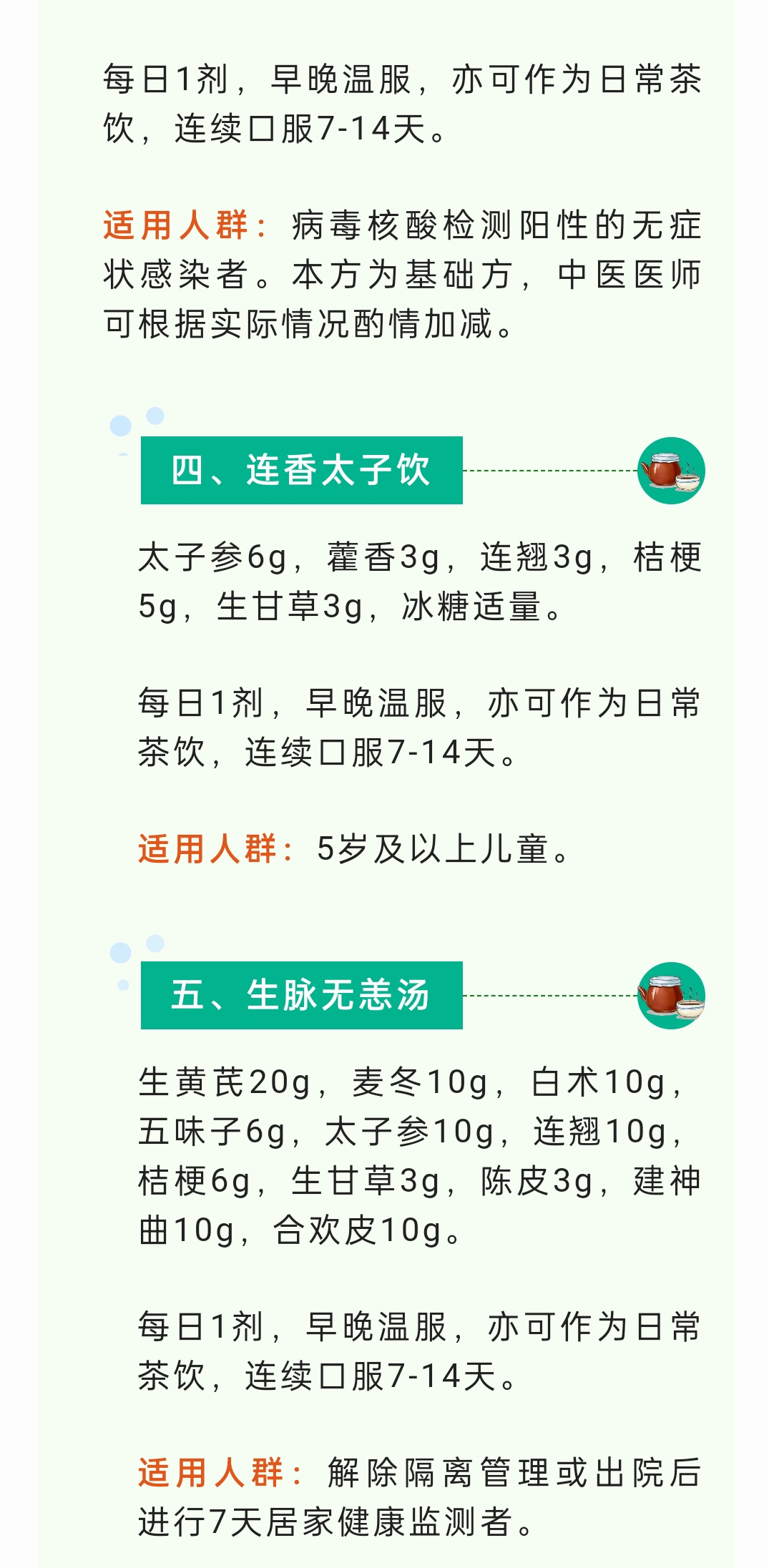 2、适应症:适用于轻型新冠肺炎、无症状感染者及密接、次密接、一线防疫和医务人员等重点人群。具有解表除湿、清热利咽作用,同时还有增强抵抗力和抗病毒的功效,可减少病毒对身体的侵袭,达到预防和治疗新冠肺炎的效果。
