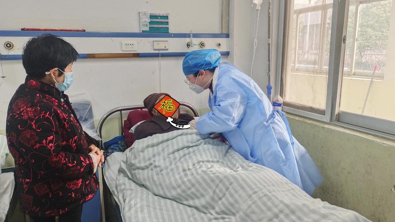 在护士站对面的一间病房,96岁的患者孙某良半靠在病床上做着雾化吸入。据老人儿子介绍,12月30日,父亲因发热、浑身疼痛、咳嗽咳痰、胸闷三天由楚店镇卫生院送入我院急诊,后转入感染科。在医护团队的共同努力下,患者情况得到好转,已经出院。“在我父亲住院期间,治疗效果不错,医生护士也很贴心,有什么需求,他们随叫随到。”家属满意地说道。