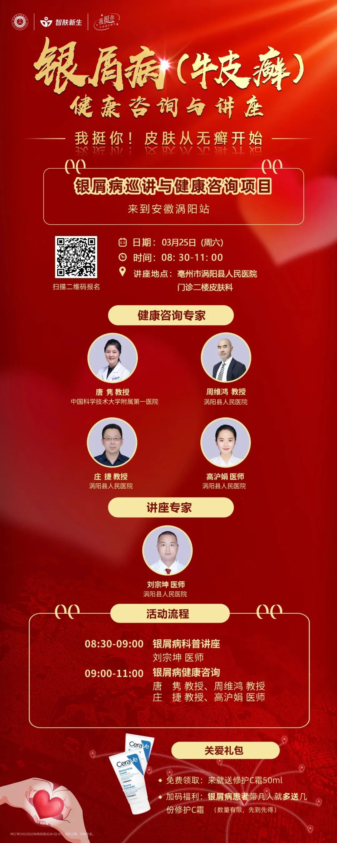 专家咨询前将在涡阳县人民医院急救中心门诊楼三楼会议厅开展银屑病科普知识讲座,加深银友们对银屑病的了解,由此增强银友们治疗疾病的信心。欢迎广大银友前来参与!