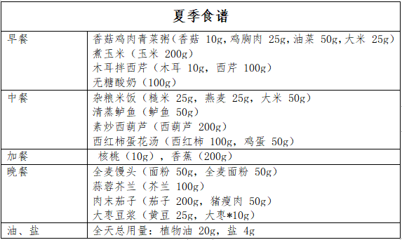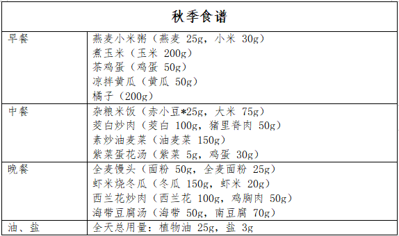 四季食谱示例(以生重计,具体见下图)。食谱适合轻身体活动水平的成人高血压患者,一天食谱的能量在 1600~2000kcal范围,可结合自身活动量及其他因素合理调整能量。( 营养科)