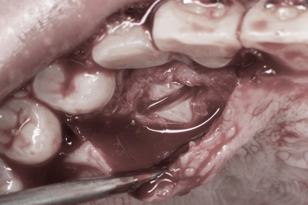 对患者术前资料进行分析后,杨华一于2月25日在同伴的配合下,为患者施行手术。术中发现该阻生牙为完全骨埋伏,卡在2颗邻牙的牙根之间,拔除难度本就不小,加之当时三颗邻牙已摇摇欲坠,手术过程中稍一用力都可能导致邻牙脱落。
