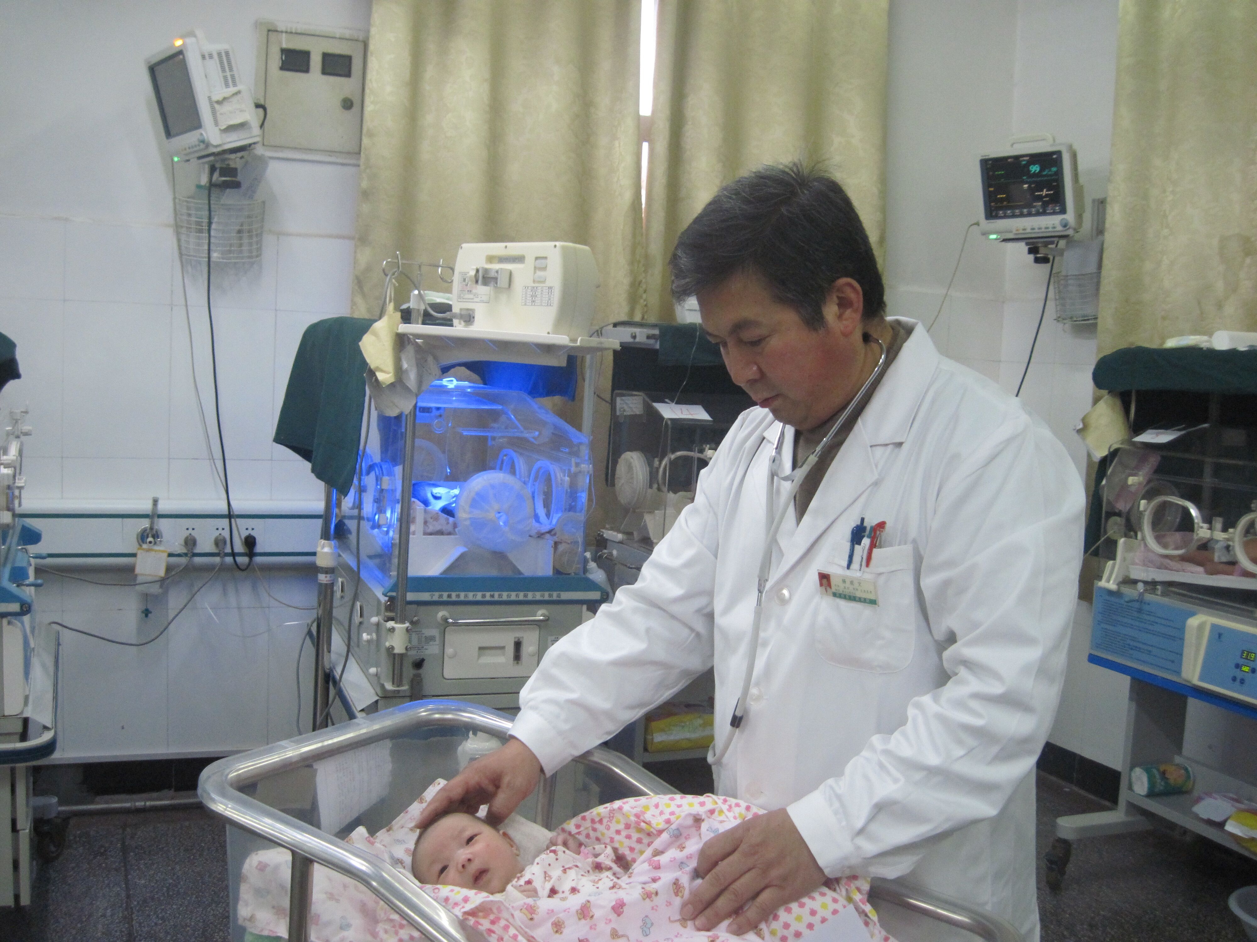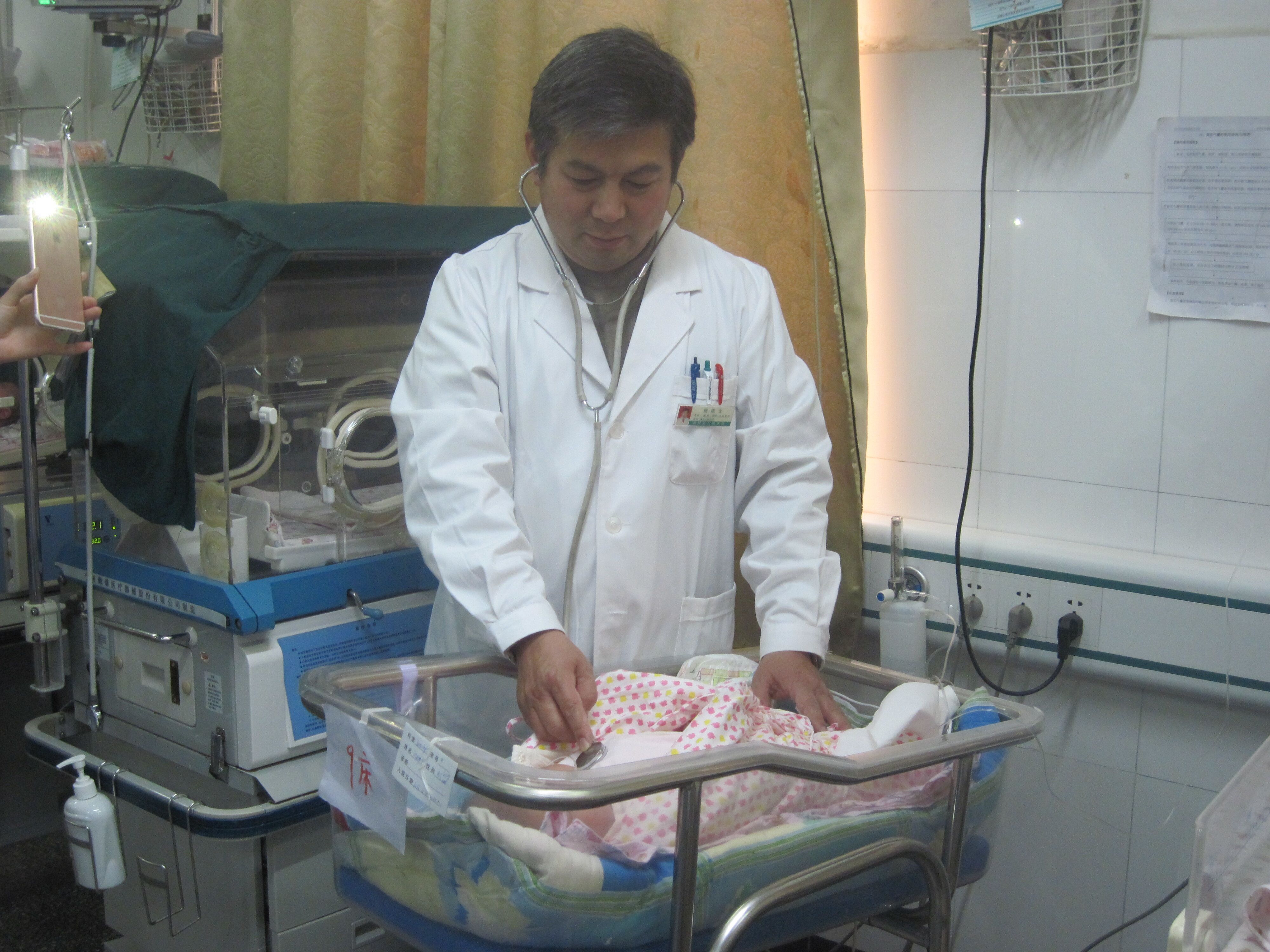 (杨成文在为患儿听心率)