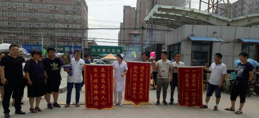 7月3日上午,我院的大门口突然响起热闹的鞭炮声,这吸引了好多围观群众,原来是又有患者到我院送锦旗。这次来送锦旗的患者出院已经两个多月,病情恢复的比较好,今天她特意在儿子和女儿的陪同下给我院送来三面锦旗和一束鲜花,真诚的感谢脑外科在自己住院期间给予的精心治疗和优质护理。第一面送给神经外科副主任周维广的锦旗印着“救死扶伤 在世华佗 德艺双馨 名医风范”,第二面送给神经外科重症监护室的锦旗印着“医术精湛除病痛 医德高尚暖人心”,第三面送给神经外科全体医护人员的锦旗印着“一流医德 一流服务 一流医术 一流医风”,患者和家属对我院脑外科的感激之情跃然“旗”上。