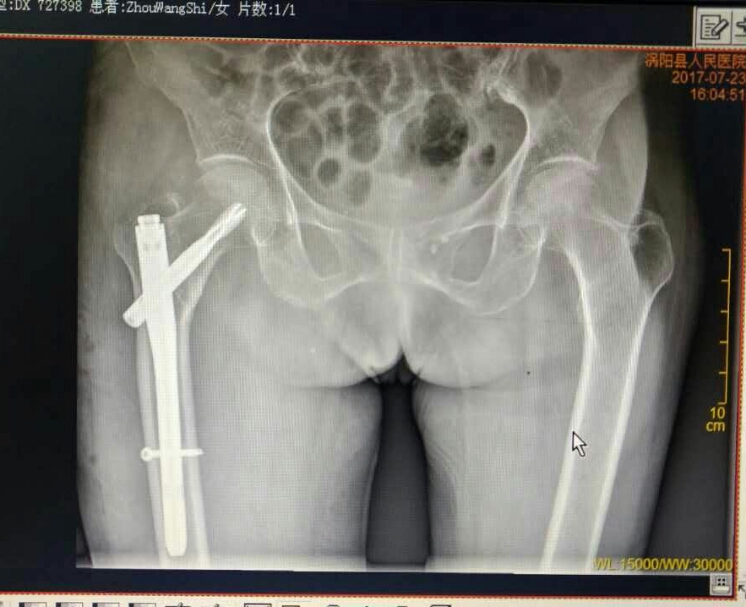 7月17日晚上,家住楚店镇周东村的王奶奶不慎在家摔倒,腿部剧烈疼痛,不能站立和行走,家人急忙将老人送至我院救治,经诊断为右股骨粗隆间骨折,需要住院治疗。副主任医师王洪灵为老人进行了详细的检查,发现患者不仅右股骨粗隆间骨折,还伴有严重的骨质疏松症,且老人年岁已高,身体各项机能退化,手术治疗存在很大的风险性,但是成功后老人就能重新站起来。为慎重起见,骨一科为患者拟定了详细的治疗方案和各种预案,经过充分的术前准备后,于7月20日下午在硬膜外麻醉下为百岁老人行右股骨粗隆间骨折闭合复位PFNA内固定术,手术在主任王海洋的指导下,由副主任医师王洪灵主刀,副主任医师柴林涛协助开展。凭着娴熟的业务技术和充分的术前准备,在相关科室的密切配合下,手术团队仅用40分钟便成功为老人完成手术。术后,在我院骨一科医护人员的精心治疗和护理下,老人恢复较好,7月24日顺利出院,患者及其家人非常满意,对我院骨一科的精湛医术和精心照料赞不绝口。