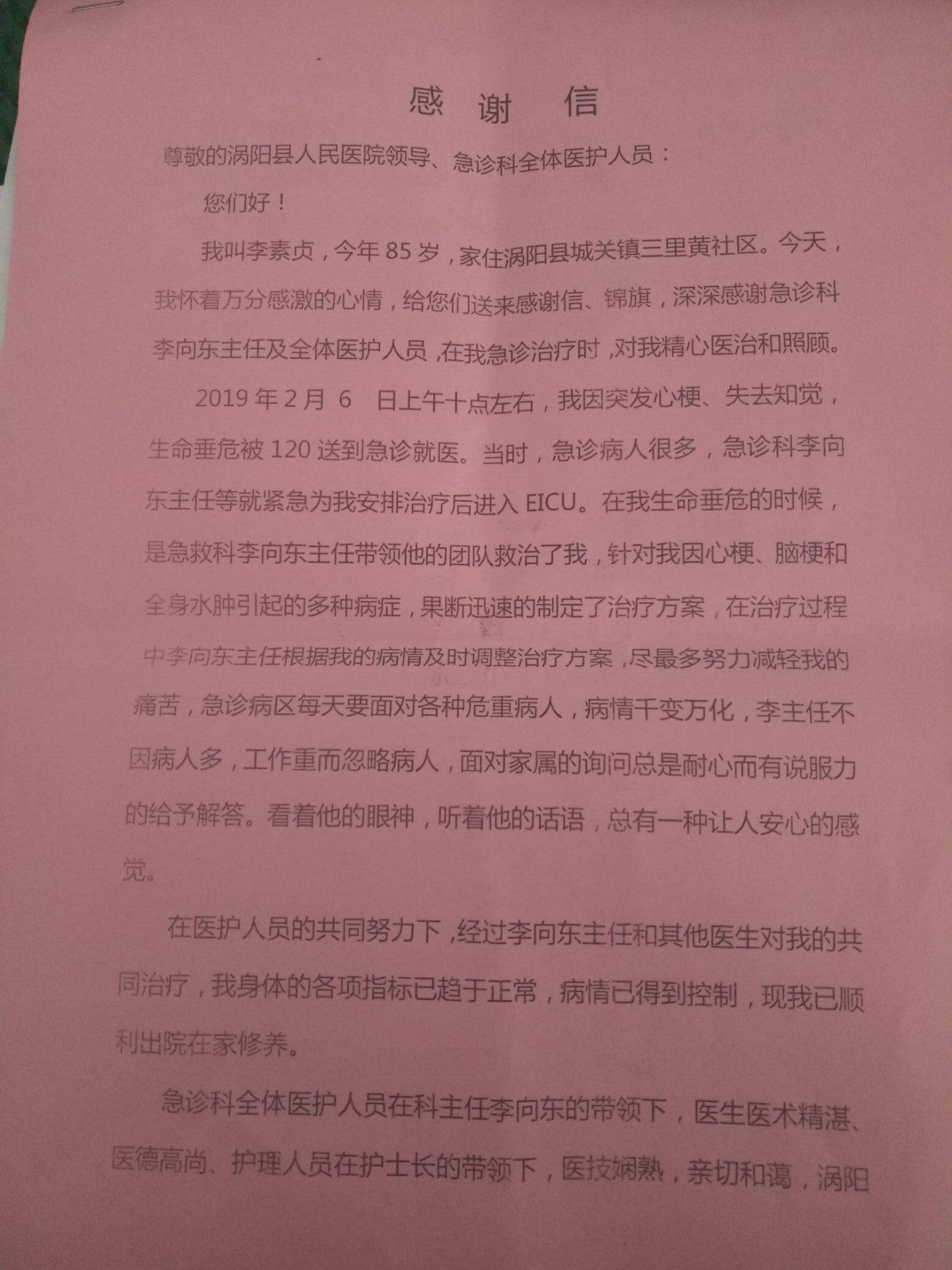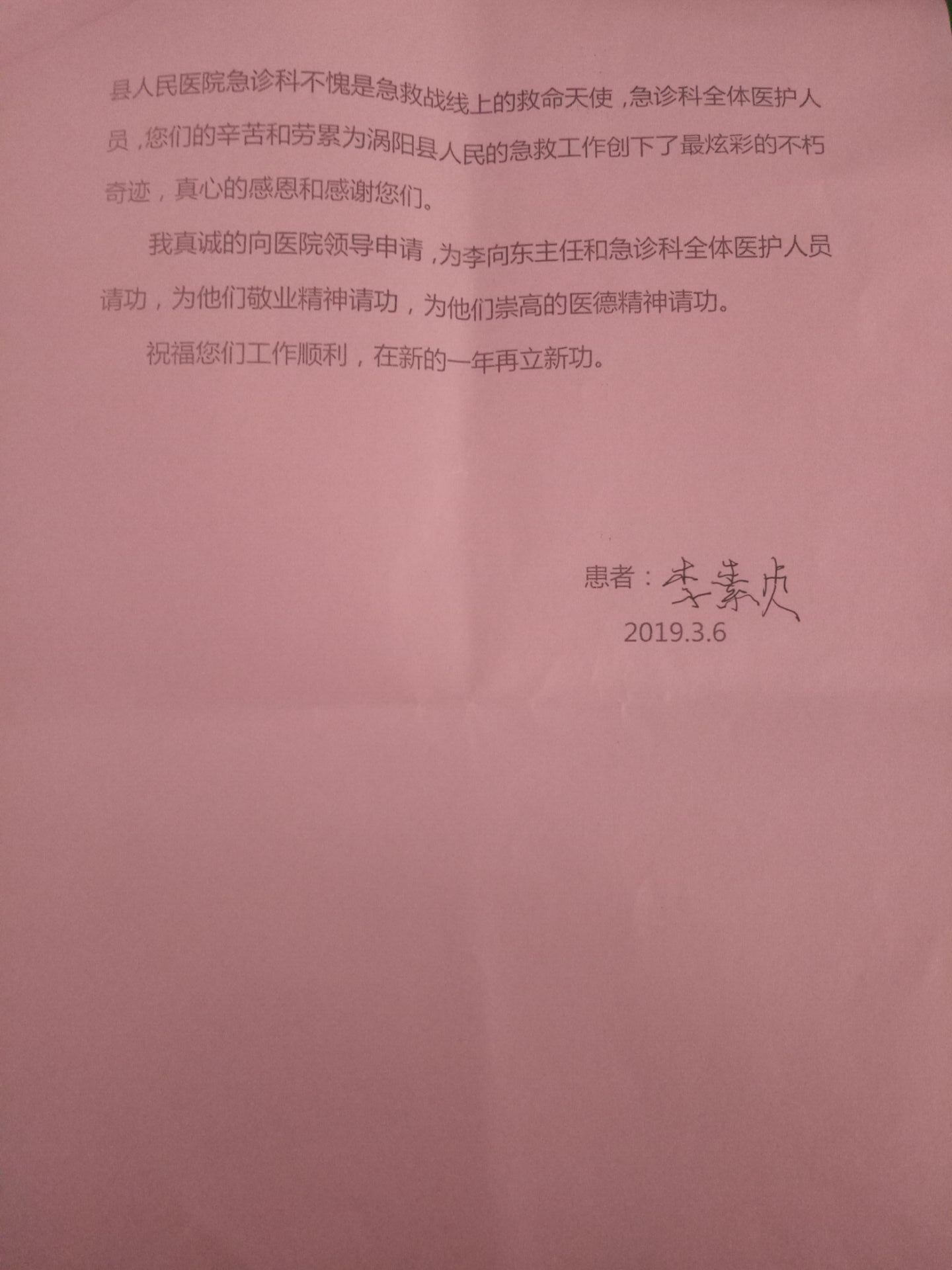 2019年3月6日上午,涡阳县人民医院急诊科门口再度上演了温馨感人的一幕,一位患者家属将一面饱含着真情的锦旗和一封粉色的感谢信亲手交到了急诊重症监护室主任李向东的手里,并大力称赞李主任及其团队“医术精湛、服务周到”!是什么事情让这位患者家属如此感激、如此盛赞李向东主任及其团队呢?
