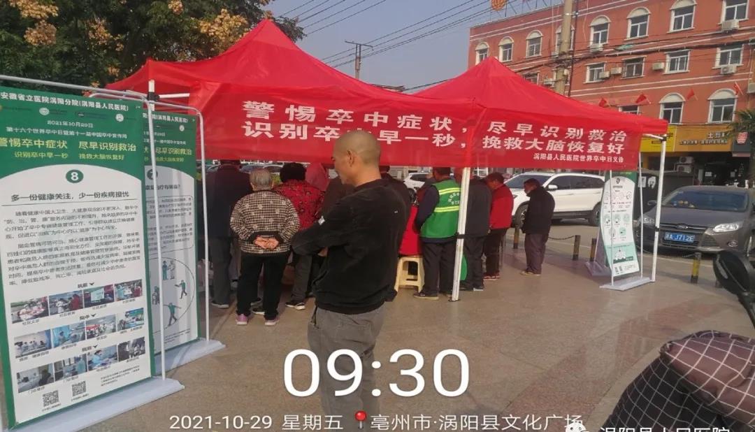 2021年10月29日是第16个“世界卒中日”, 为提高广大群众对脑卒中的防控意识,本次活动以"警惕卒中症状,尽早识别救治"为主题,“识别卒中早一秒,挽救大脑恢复好”为口号开展。活动旨在助力“健康中国行动”,实施心脑血管疾病防治行动,开展健康知识普及行动;倡导科学“大健康”理念。10月29日我院卒中中心医疗团队分别在新区门诊大厅一楼、涡阳县第一中学、涡阳县文化广场开展了阵容强大的主题宣传和义诊活动。