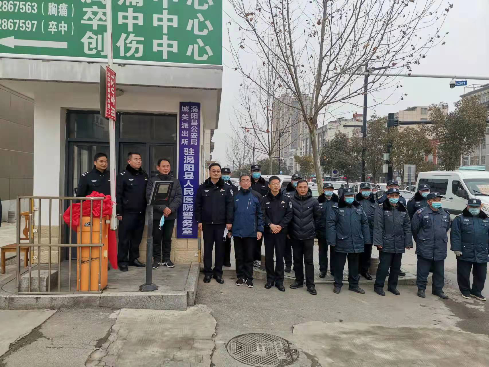2022年1月28日,“涡阳县公安局城关派出所驻涡阳县人民医院警务室”揭牌仪式在我院急诊楼前举行。院党委书记曹锡君和县公安局政委刘振共同为警务室揭牌,参加揭牌仪式的有医院院长吴绍山、院党委委员张永强、公安局副政委张礼、警务保障室主任李志明、城关派出所教导员郭伟等。