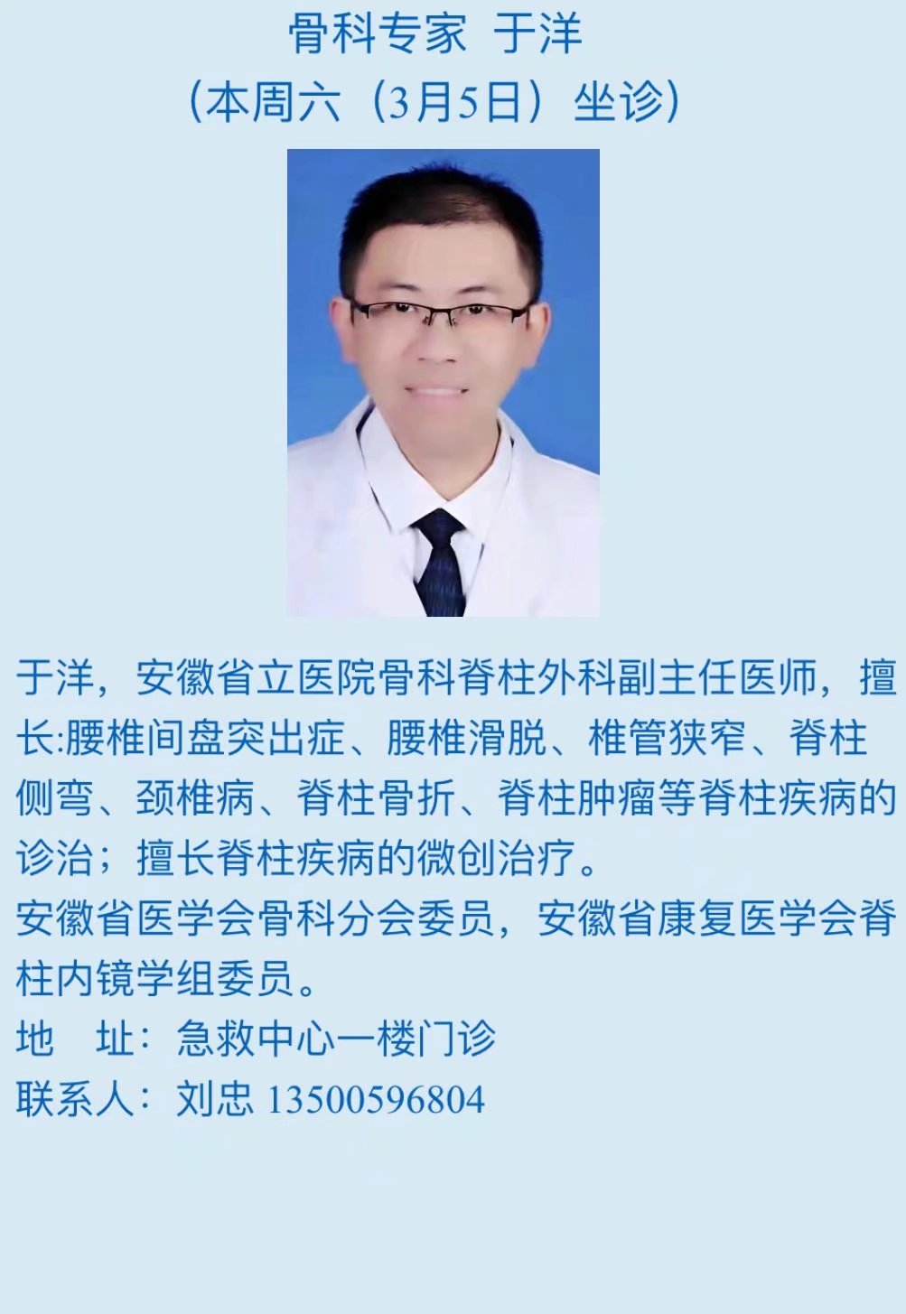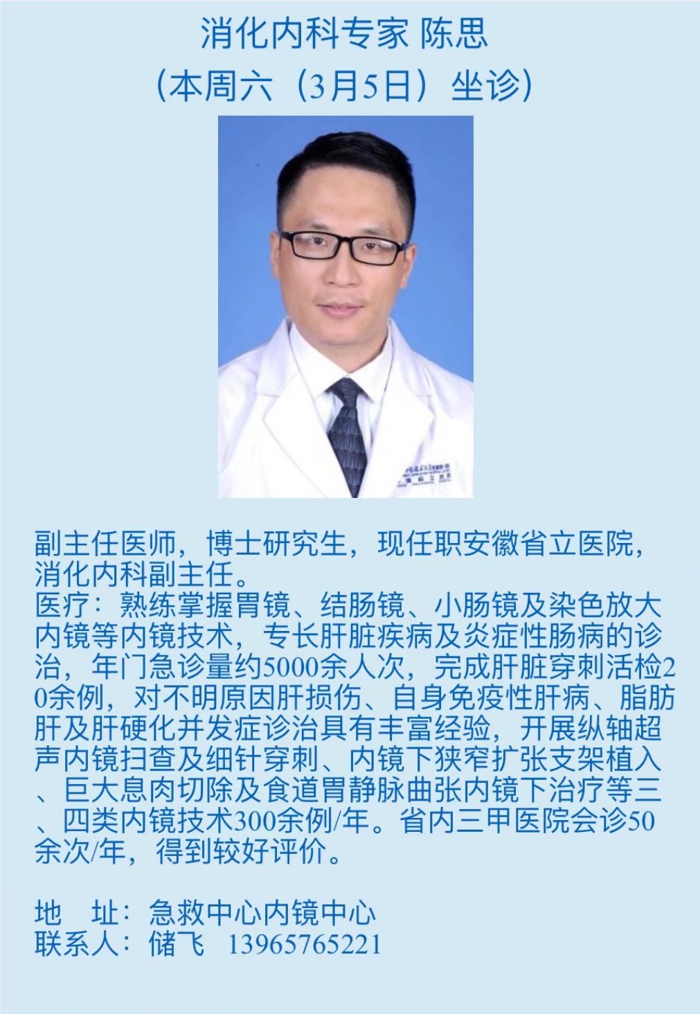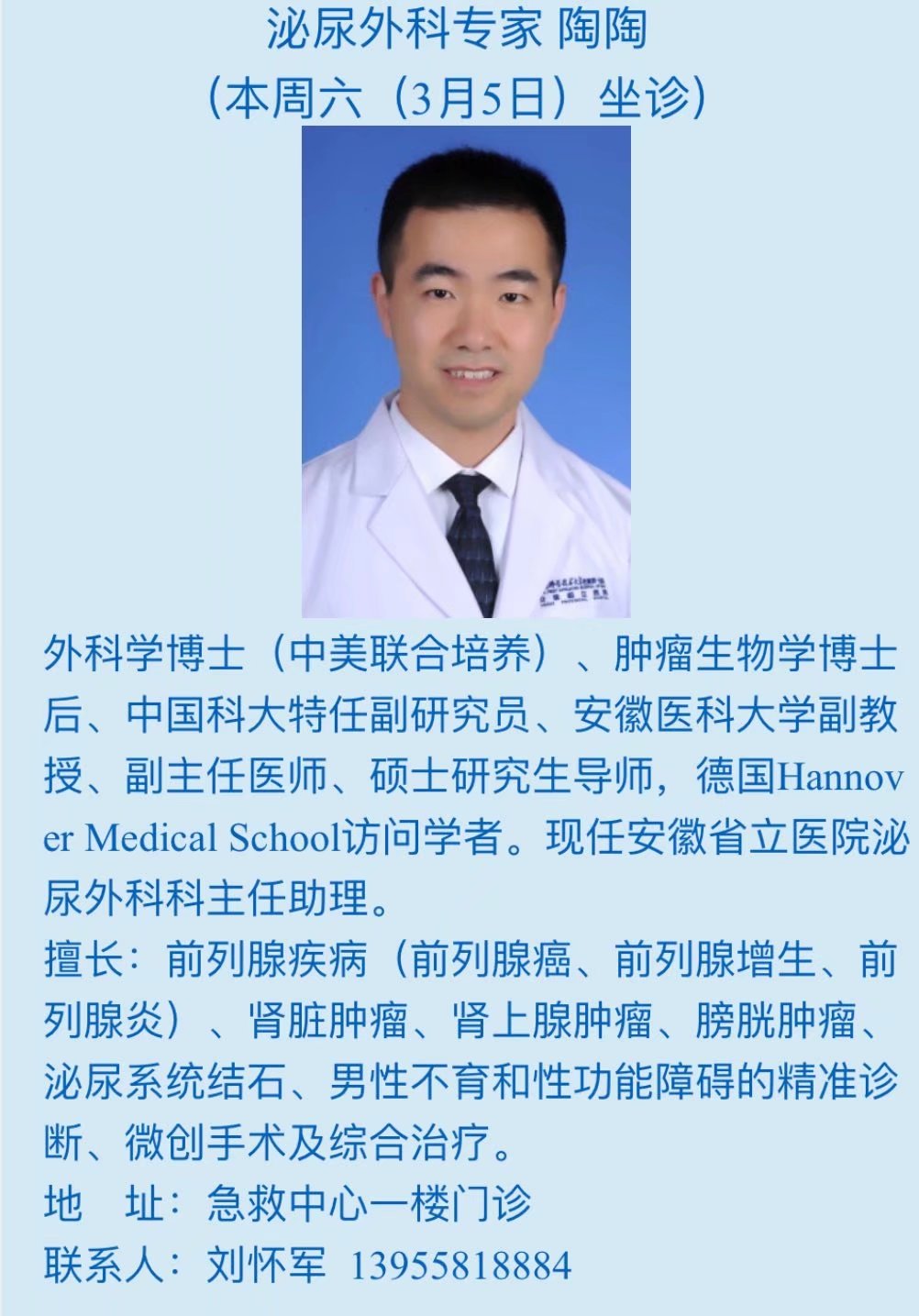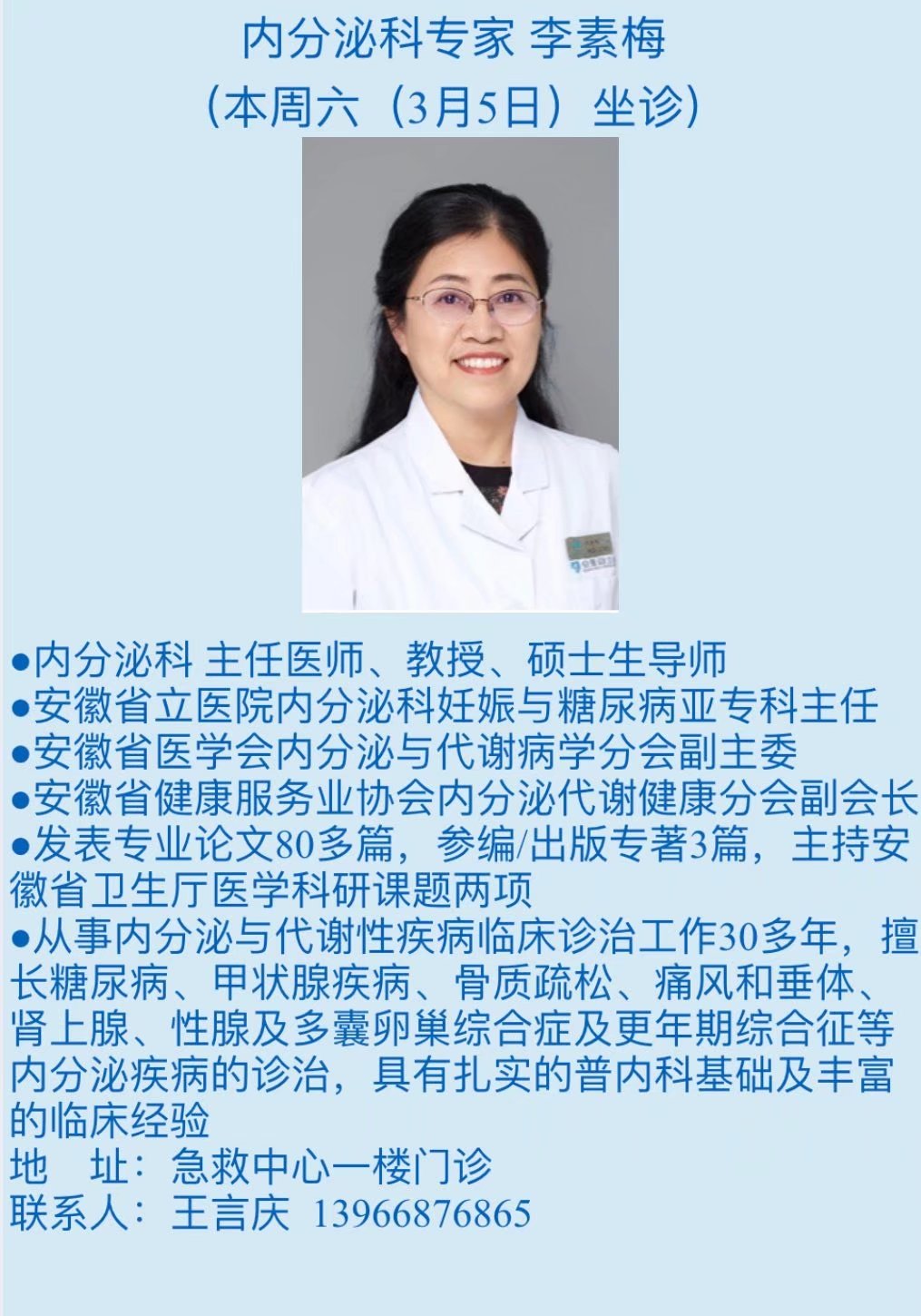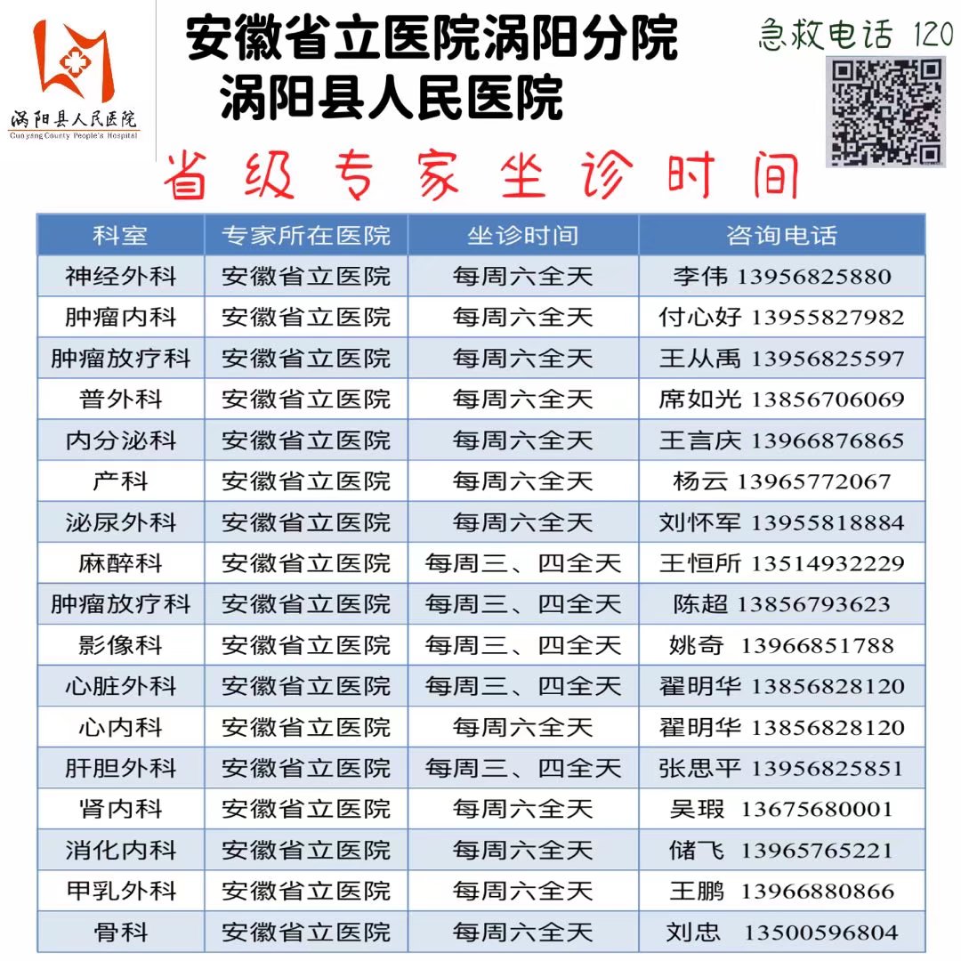 3月5日(本周六)中科大附一院(安徽省立医院)专家来我院坐诊信息
