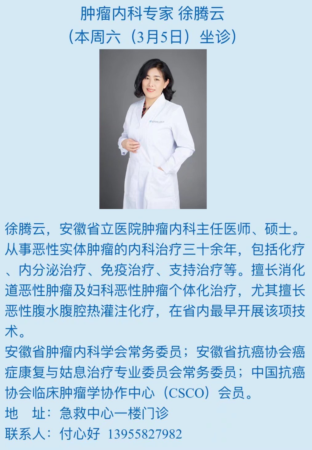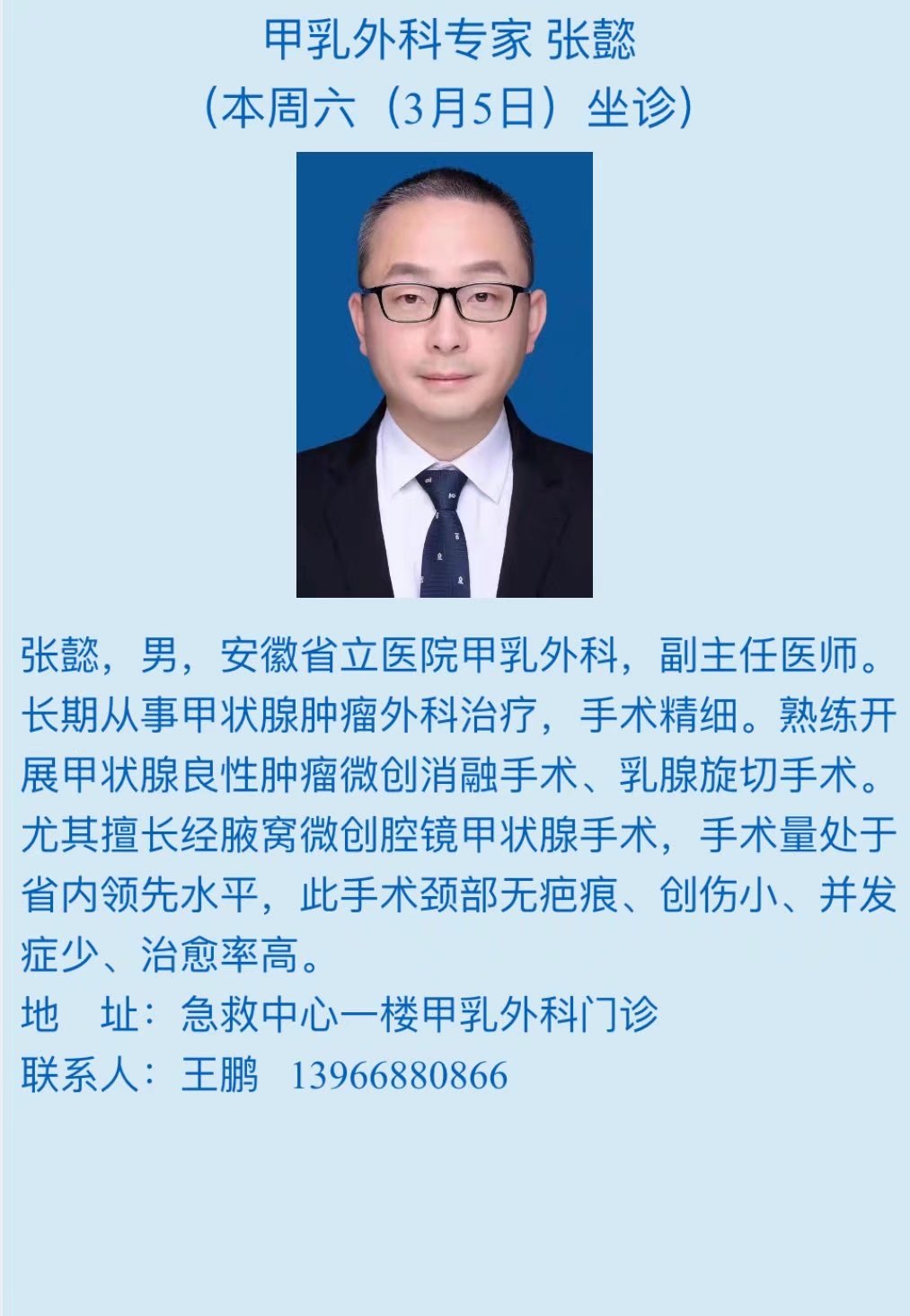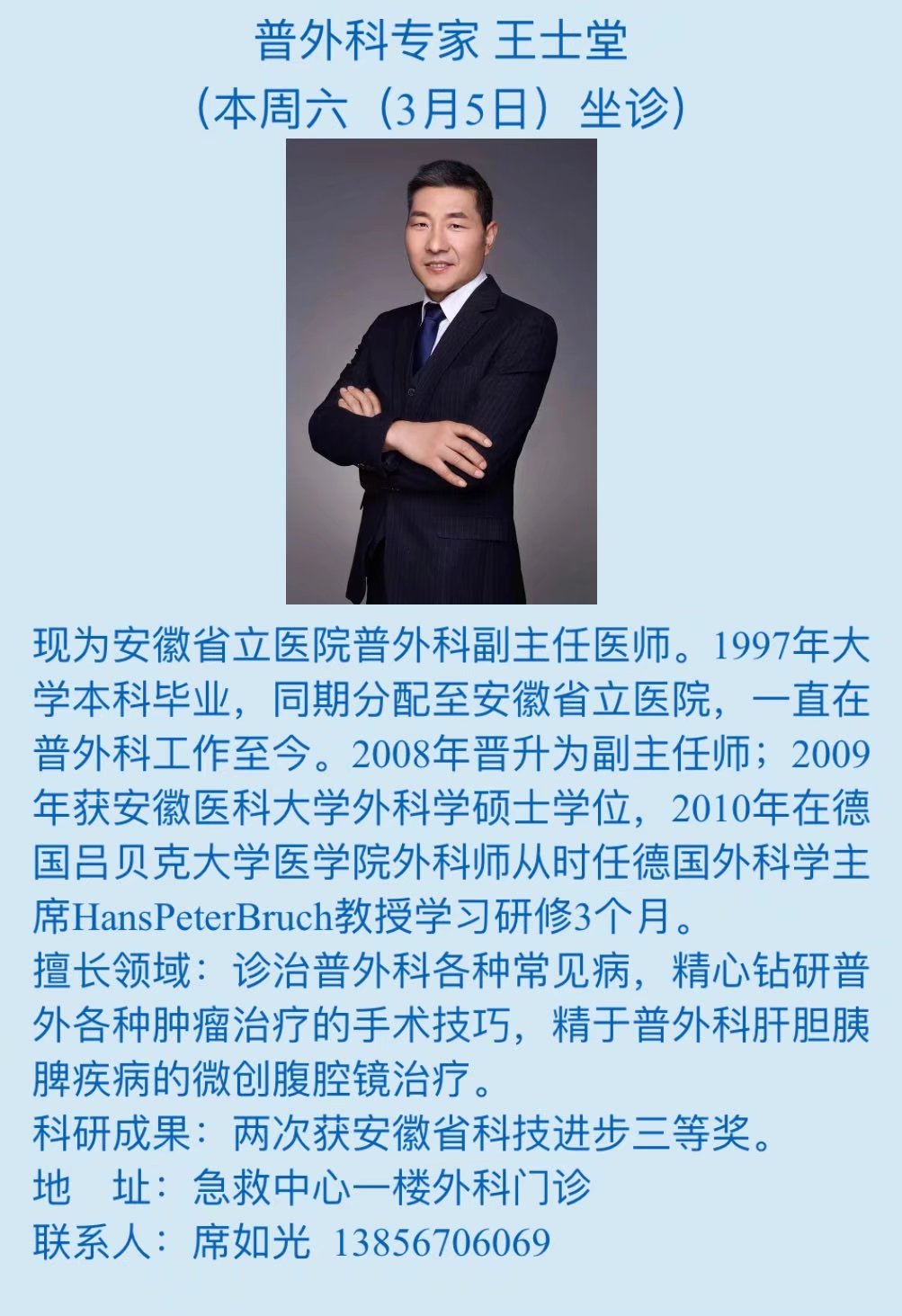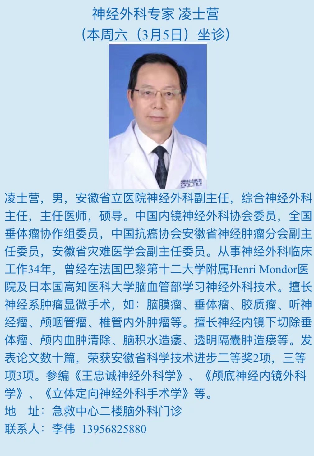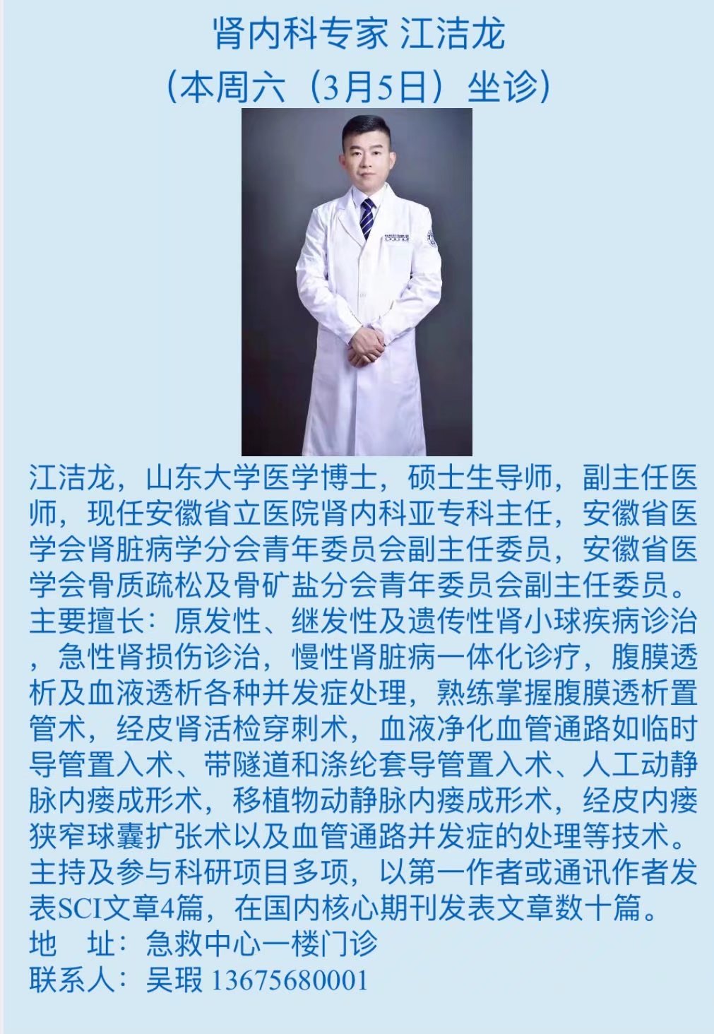 3月5日(本周六)中科大附一院(安徽省立医院)专家来我院坐诊信息