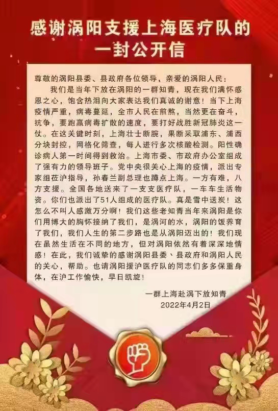 附:上海赴涡下放知青感谢涡阳支援上海医疗队的一封公开信
