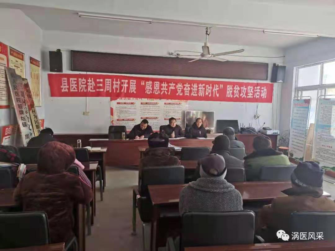 12月31日上午,党委委员马耀华、党办室主任周预晓等一行四人到我院扶贫帮扶点牌坊镇三周村开展“感恩共产党 奋进新时代”脱贫攻坚主题活动。三周村“两委”负责人、脱贫示范户和脱贫户、贫困群众等参加会议。会议由马耀华同志主持。