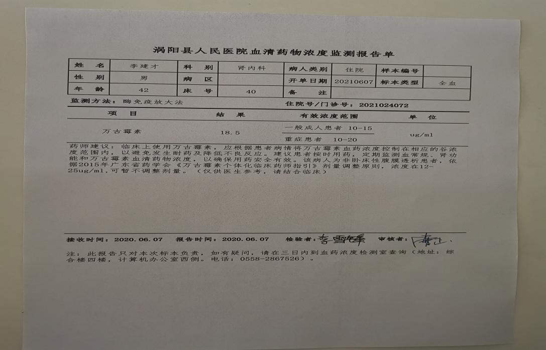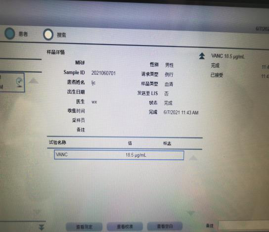 6月7日,血清药物浓度监测室正式开展工作,并于当日上午,成功为肾内科一名使用万古霉素的患者进行了血清药物浓度监测,并根据监测结果,给予临床合理用药建议。