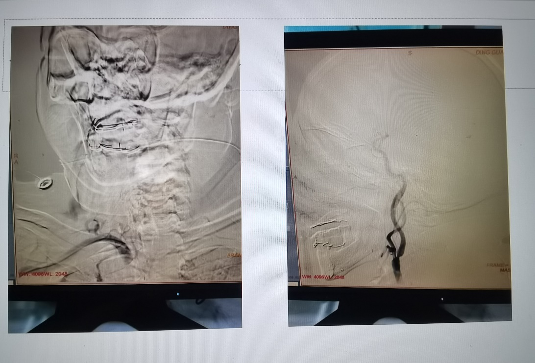 2022年7月12日,神经内科副主任徐永、医师丁会朋完成我院第一例经桡动脉全脑血管造影术。患者是一位77岁高龄男性,因反复头晕就诊我院神经内科,门诊行颈动脉超声提示左侧颈动脉中重度狭窄,为明确诊断及下一步治疗方案,收住神经内科行全脑血管造影检查。7月12日下午14点30分,手术开始,多次尝试股动脉置鞘,虽双侧股动脉穿刺均成功,但导丝无法顺利通过,考虑双侧股动脉粥样硬化狭窄。经全面评估后,决定经桡动脉穿刺完成手术。经桡动脉穿刺行全脑血管造影,所选造影材料不同于普通造影材料,操作困难,手术难度更大,经过约2小时的精心操作,在导管室和心内科的通力协作下,手术顺利完成。整台手术,患者神志清楚,无明显不适主诉,安返病房。经过造影评估,患者左侧颈内动脉起始段狭窄约70%,择期给予颈内动脉支架植入术。(徐永)