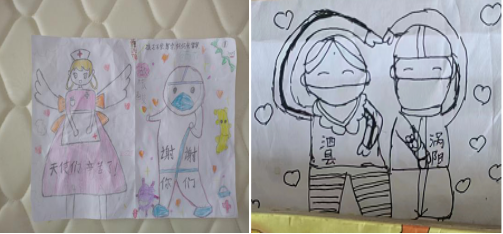 这一句句真情流露的感谢话语,小朋友们的即兴画作,让身心俱疲的驻点医护人员倍感幸福。正如许家祥和韩恩惠在信中所说:“隔离空间,不隔离关心;隔离病毒,不隔离爱心。我相信只要我们一起努力疫情总会过去的。”(朱玲)