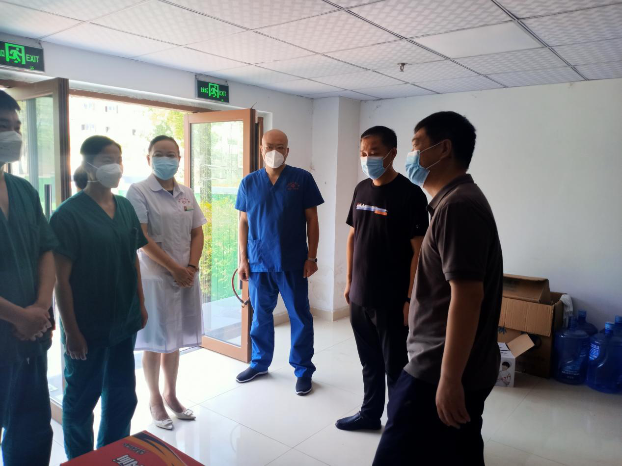 为落实上级有关夏日送清凉、开展关心关爱相关工作要求,2022年8月4日,院党委书记张锦带领党委委员、工会主席韩敏,党委委员、纪委书记栗莉平,党委委员张永强,护理部主任徐程莹前往邻里中心隔离点、隔离酒店、急诊、检验科、发热门诊、安保部、核酸检测点、预检分诊等处看望慰问高温天气中仍坚守疫情防控和医疗救治重点工作岗位的医护人员,为他们送去生活用品、食品饮料等物资,同时送去炎炎夏日院领导班子的关心关爱。
