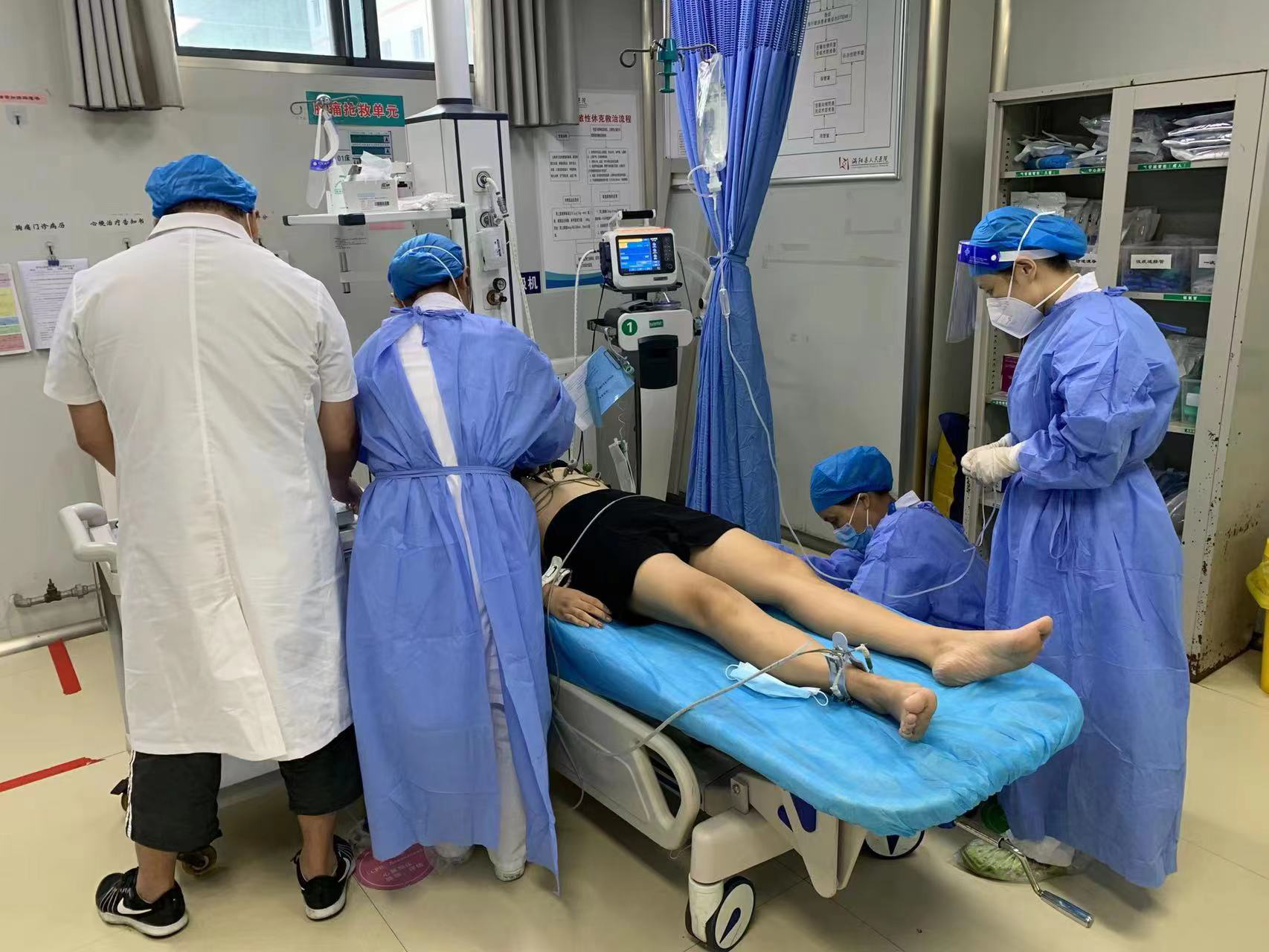 2022年8月5日下午三点,在涡阳县人民医院急诊科,孙明医生和盛化美护士正值守抢救室。突然,刺耳的警笛声传入耳际,原来是黄码医院的一名隔离人员突发心脏病,由负压救护车转入急诊救治。因为隔离观察原因,当时并无家人陪护。在了解情况后,他们立即把病人转入隔离抢救室。