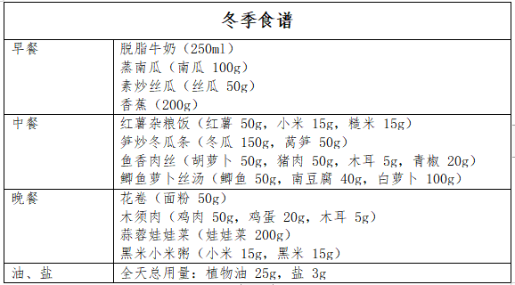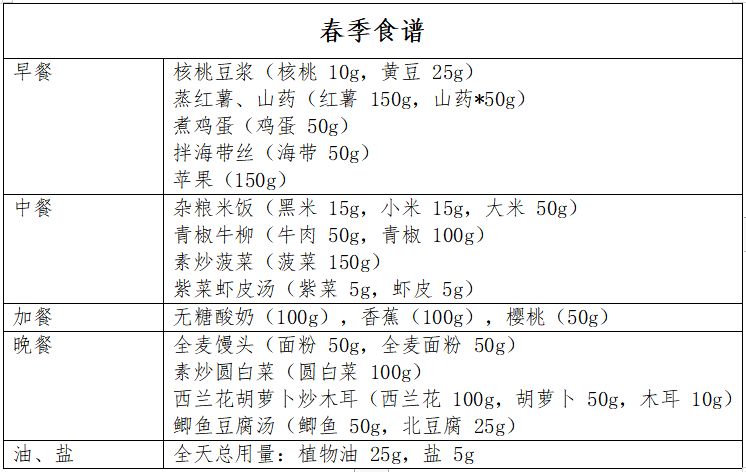 四季食谱示例(以生重计,具体见下图)。食谱适合轻身体活动水平的成人高血压患者,一天食谱的能量在 1600~2000kcal范围,可结合自身活动量及其他因素合理调整能量。( 营养科)