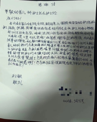 两位孩子病情逐渐好转,宝妈为了表达感谢之情,写了一封感谢信,给我们护理团队和主治医生送了面锦旗,又特意订了两束鲜花送到护士站,还特别表明是为了感谢我们孔护士长及带领的护理团队,为每一份关照和护理都温暖入心,使她感动万分,其实工作中,有了病人的支持和理解,工作再累再苦都是值得的!(陈莉 孔苗苗)