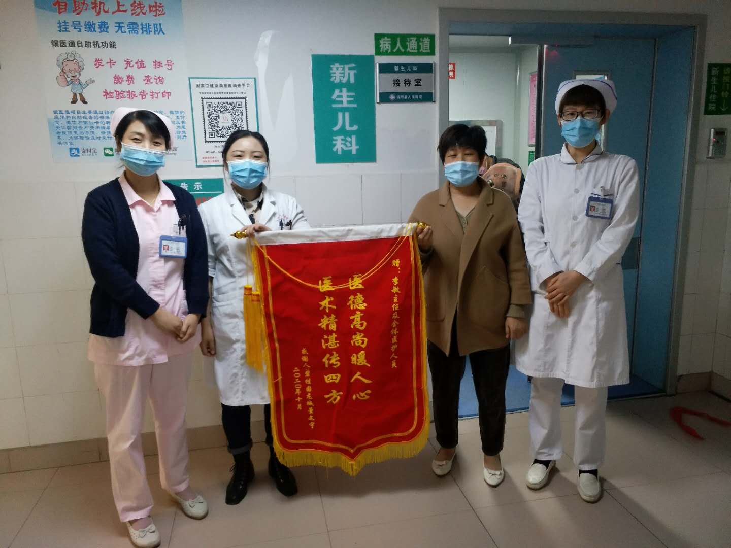 10月19日上午,一位患儿家属将一面写着“医德高尚暖人心 医术精湛传四方”的锦旗,送到了涡阳县人民医院新生儿科医生李敏和护士们手中,向她们以及新生儿科全体医护人员表达最真挚的感谢。