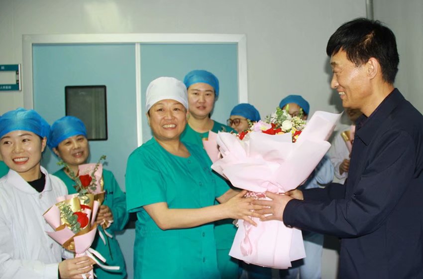 2021年5月5日国际助产士日,涡阳县人民医院组织办公室、医务部、护理部到产科产房为这群平凡又可爱的白衣天使群体送去致敬的鲜花。院党委委员、副院长张艳环、妇产科主任杨云、助产长马静携全体助产士夹道欢迎。