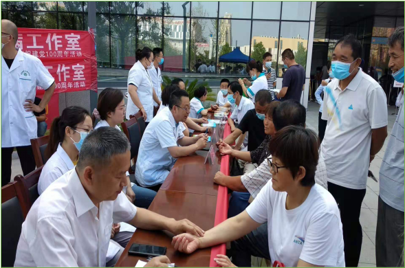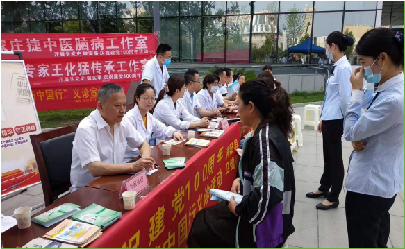 为庆祝中国共产党成立100周年,我院党委委员、工会主席韩敏、副院长王化猛带领我院中西医结合科主任庄捷与科室人员于7月1日到市民服务中心进行义诊。王化猛、庄捷等医疗专家先后进行中医诊疗共计100余人次,宣传中医适宜技术等手册300余份,现场解答疑惑100余人次。
