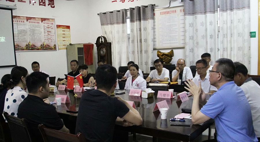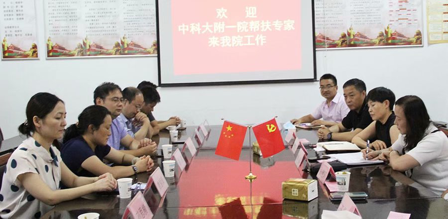 7月6日,中科大附一院(安徽省立医院)第11批帮扶专家到我院报到,帮扶业务对接会议于当日下午五时在三楼会议室举行。会议室多媒体屏:“欢迎中科大附一院帮扶专家来我院工作”字样。院党委书记曹锡君、院长吴绍山带领领导班子成员及相关科室负责人参加了对接会议。院党委委员杨平礼主持并介绍第11批帮扶专家情况。他们是消化内科副主任医师陈思,也是这批帮扶专家的队长。病理科彭燕、肿瘤放疗科雕丽琼、急诊外科甘磊磊、普外科孙思楠、麻醉科居福宏、影像科刘畅、心脏外科张锡东。会上,帮扶专家陈思作表态发言,表示遵守医院纪律,带动科室开展新技术,拓展新业务,使县医院再上新台阶。