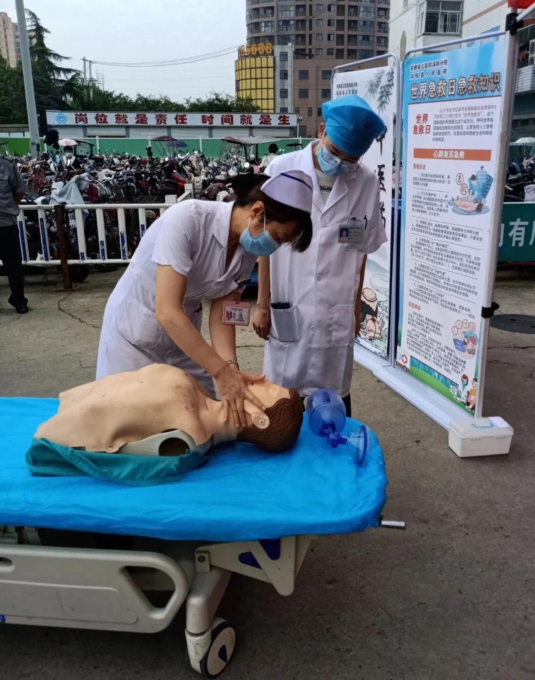 活动现场,设置了急救知识展板和宣传单,急诊科医护人员向过往群众讲解中暑、溺水等常见急救知识和措施,通过模拟人向过往群众进行心肺复苏等应急救护技能演示,并手把手教授群众学习正确的急救方法。