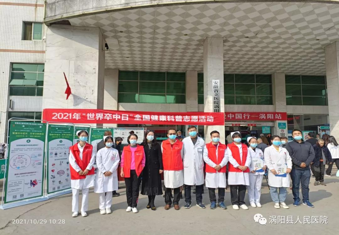 2021年10月29日是第16个“世界卒中日”, 为提高广大群众对脑卒中的防控意识,本次活动以"警惕卒中症状,尽早识别救治"为主题,“识别卒中早一秒,挽救大脑恢复好”为口号开展。活动旨在助力“健康中国行动”,实施心脑血管疾病防治行动,开展健康知识普及行动;倡导科学“大健康”理念。10月29日我院卒中中心医疗团队分别在新区门诊大厅一楼、涡阳县第一中学、涡阳县文化广场开展了阵容强大的主题宣传和义诊活动。