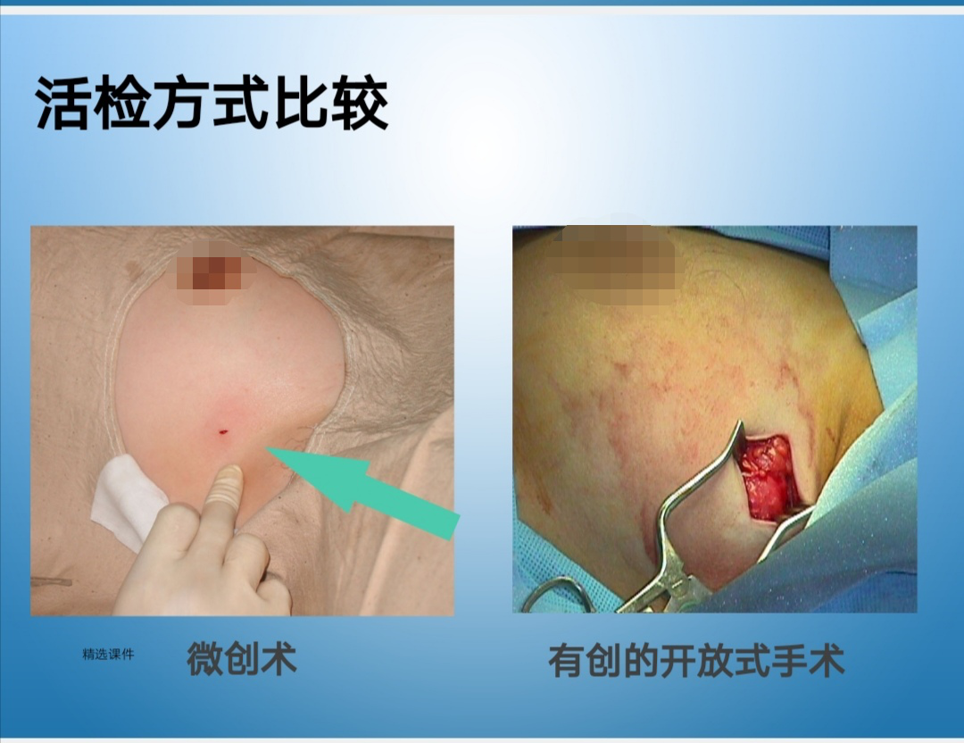 该手术可以对乳房病灶准确可靠的取样,且切口小岀血少,一次穿刺,可多次取样,切除标本量足,病理诊断更准确,术后不用拆线,3天就可恢复,这也降低了术后伤口的感染率。同时还能对乳房内肿块进行精准切除治疗,能够切除临床体格检查无法触及的肿块和传统手术难以切除的乳房病灶,极大提高了乳房微小肿块的微创切除及早期乳腺癌的诊断准确性。而传统手术只能靠手触摸定位,术中岀血较多,术后需要拆线,恢复时间长,对于多个肿块的患者只能多处作切口进行手术。