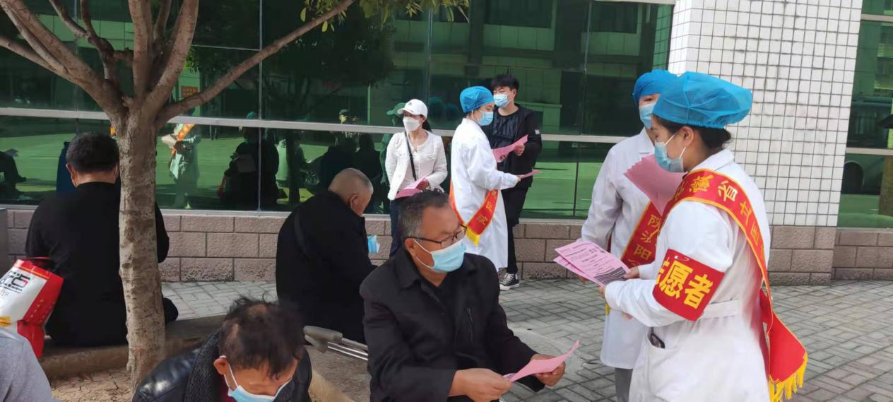 4月8日,我院医务志愿者在党委委员、工会主席韩敏的带领下到门诊大厅、院内核酸采集点、移动核酸采集车、医院入口处等人员密集地方发放疫情防控宣传单,并指导侯诊患者间隔就坐、提醒未戴好口罩的患者按规范戴好口罩。向群众科普相关防疫知识,提高群众主动参与疫情防控自觉性。