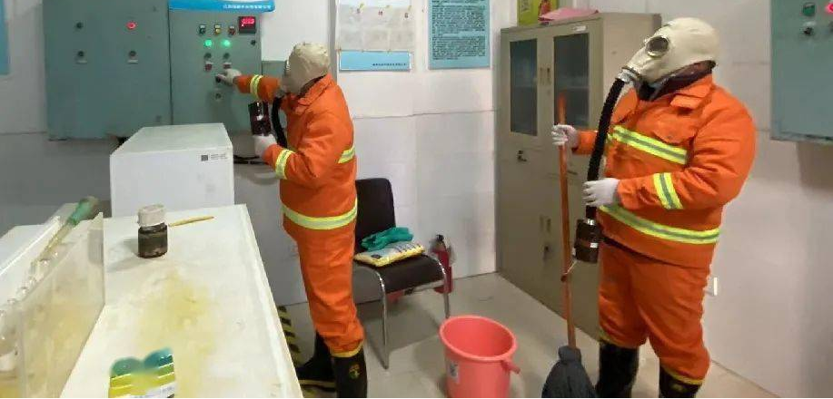 班长A开罐区边消防栓,对泄漏的沼气现场进行清理消毒。现场沼气气体有所减淡。